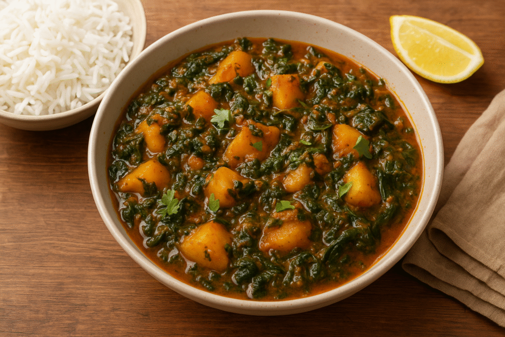 This dish is inspired by a traditional Pakistani curry, known for its simplicity and depth of flavor. Using frozen spinach not only makes it cost-effective but also ensures a consistent texture and taste. The combination of spices like cumin, coriander, and turmeric infuses the potatoes and spinach with a warm, aromatic profile, while the addition of lemon juice at the end brightens the dish, balancing the richness of the curry.